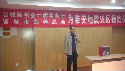 2013年4月28日下午三時(shí),陳明集團(tuán)會(huì)議室里愛(ài)意濃濃,正在舉行為雅安地震捐款獻(xiàn)愛(ài)心活動(dòng),此次捐款活動(dòng)我們有幸請(qǐng)到了晉城市慈善總會(huì)陳副會(huì)長(zhǎng)光臨并作了重要講話,表示一定將陳明集團(tuán)全體員工的愛(ài)心送到雅安同胞手上。