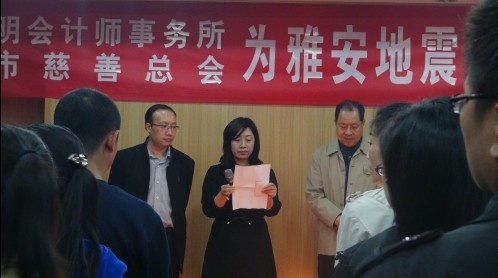 圖為陳明集團(tuán)董事長(zhǎng)陳雪琴代表單位為雅安捐款